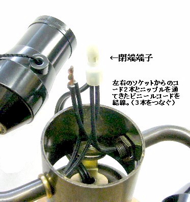 左右のソケットのコード(ジーゲル線2本)と、ビニールコードの1本の計3本をよじってから